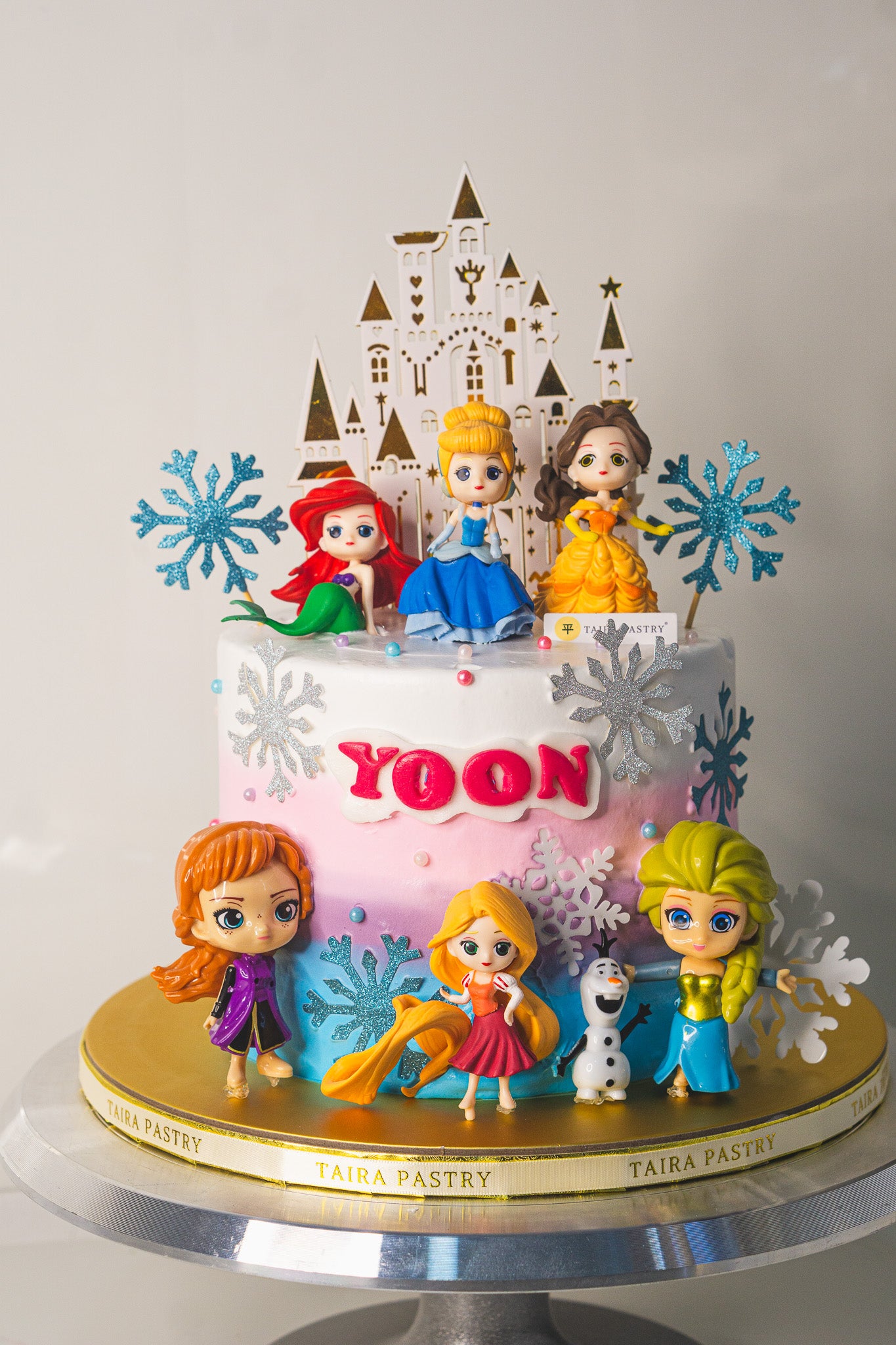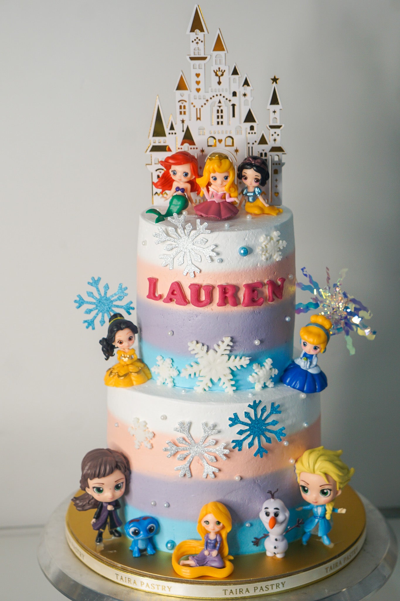 Frozen Theme Cake colour with snow flakes and edible crystal pearl, castle topper and Frozen and Disney princesses.