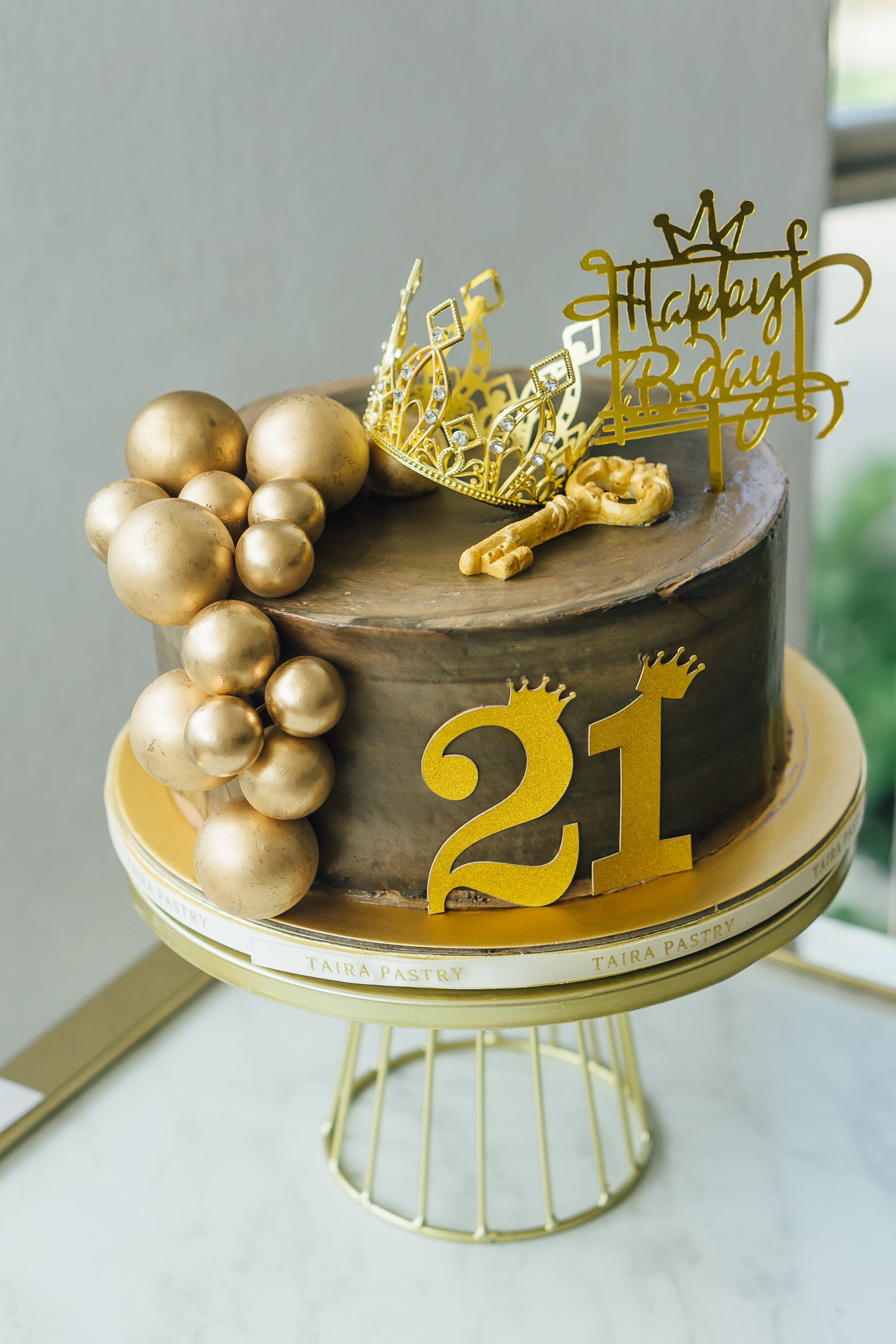 Chocolate colour cake with golden balls, golden key, golden crown, happy birthday number and birthday age.