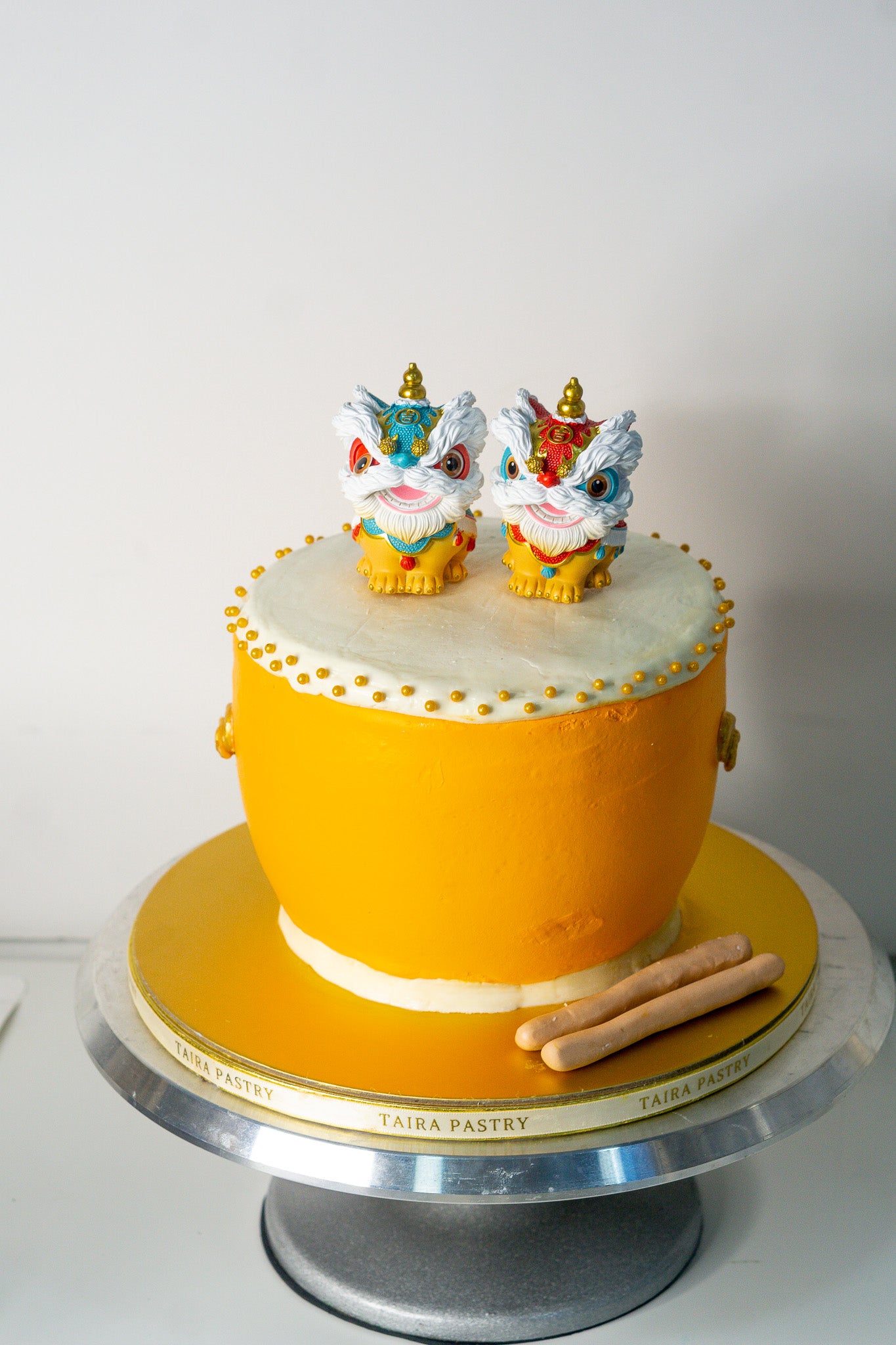 Drum shaped cake with 2 lion dance and fondant craft drum stick.