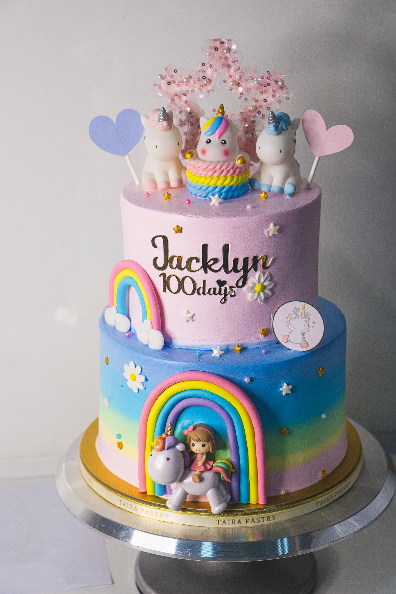 Rainbow theme cake with cute unicorns, rainbow, stars and cloud.