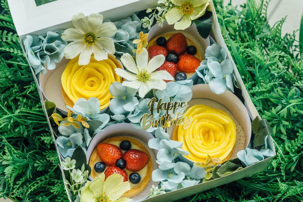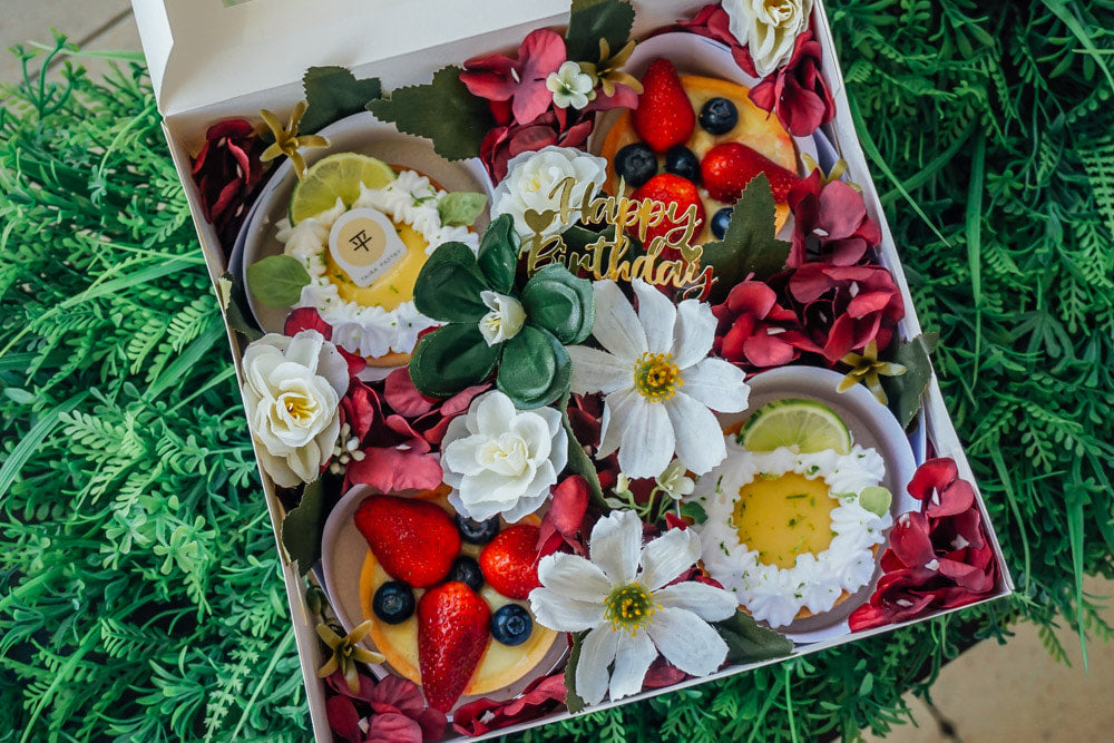 Surprise your love ones with a box of amazing looking pastries on a bed of flowers. Comes with a nicely crafted mini topper. (Choose: Happy Birthday / I Love You / Specially for you)